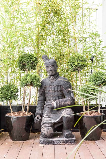 Gran sorpresa, en cada extremo del balcón hay un soldado de terracota (La Contenta) que evocan el momento en que la pareja se conoció en China.