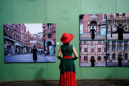 La foto dentro de la foto y dentro de la foto y así, en un bucle que no es caleidoscópico pero que invoca esa esencia. Hay una mujer en una sala de fotografías que parece dispuesta solo para ella: verde es la pared que sostiene las fotos, verde parte del atuendo de quien las observa. La mujer, captada de manera casual, está tan de espaldas como quienes -muy probablemente por fuera de los efectos del azar- posan en las imágenes que contempla. La escena ocurre en el marco del Festival Internacional de Fotografía de Pingyao (PIP, por sus siglas en inglés), antiguo poblado en la provincia de Shanxi, al norte de China. Más de 5.000 fotógrafos nacionales y extranjeros se dieron cita en ese lugar; uno de ellos es el artífice de las imágenes que observa la mujer del sombrero rojo. El otro artista, aunque no forme parte de la exposición, es el fotoperiodista que supo capturar cierto instante.