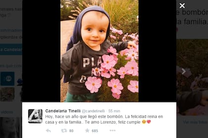 Los Tinelli están de fiesta. Sí, hoy el menor de los herederos del conductor de Showmatch cumple un año. Como era de esperar los homenajes en las redes sociales no se hicieron esperar. Primero fue su papá Marcelo Hugo quien publicó una tierna foto con Lolo al que le dedicó un mensaje muy cariñoso: "Hace un año me hiciste el ser más feliz de la tierra. Feliz cumple Lolito, hijo adorado", reza el título de la foto. Candelaria, hermana del flamante cumpleañero hizo lo propio en su cuenta de Twitter: "Hoy, hace un año que llegó este bombón. La felicidad reina en casa y en la familia.. Te amo Lorenzo, feliz cumple" escribió.