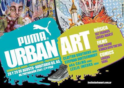 Por tercera vez, siempre en el Auditorio Buenos Aires (Av. Pueyrredon 2501) y con entrada libre y gratuita, los días 28 y 29 de agosto se realizará la tercera edición de Puma Urban Art, evento auspiciado por la firma de ropa deportiva alemana que se caracteriza por traer al país a íconos del arte urbano de todo el mundo. En este caso serán de la partida de la directora de cine Leslie Iwerk (directora de los films The Hand Behind The Mouse y The Pixar Story, que serán proyectados en esta ocasión); el ilustrador Stephan Doitschinoff, que también es conocido por su alias de Calma y que realizó intervenciones en las favelas de su Brasil natal y los videastas Clayton Brothers, que estuvieron tras las cámaras en el clip de "All Around The World" de Oasis. También habrá bandas en vivo (107 Faunos, Lucas Martí, Carca, Coco) DJ Sets (Migue de Victoria Mil, Nairobi) y una sección dedicada al comic, con la presencias estelares de Ricardo "Liniers" Siri, Lucas Varela y El Niño Rodríguez. Una buena opción de fin de semana, en la siempre activa ciudad de Buenos Aires