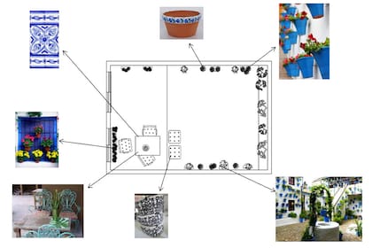 -Incorporar vegetación: Si la idea es sumar plantas, habría que hacerlo sobre los muros para darles un efecto de volumen y evitar sobrecargar el piso. Teniendo en cuenta la paleta propia del estilo andaluz, irían bien los tonos azules sugeridos Juanabanana en esta foto.