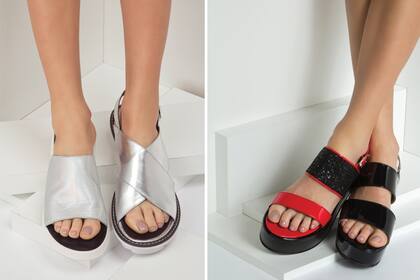 Izq: Plateadas (Viamo, $599), con tiras cruzadas (Ferraro, $1250). Der: bicolor con glitter (Blaquè, $1690), de charol con tiras (American Pie, $1280).