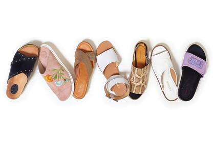 Con tachas, $980, Portsaid. De gamuza, $3600, Sofi Sarkany. Doradas, $1400, Vía Uno. Con pulsera, $1650, A Pie. De reptil, $3450, Kosiuko. Sin talón, $1500, Yagmour. Bicolor, $2800, Juanita Jo.
