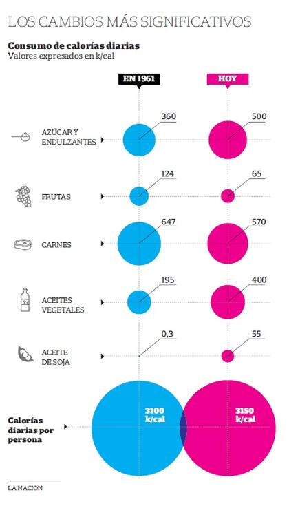 Uno de los hallazgos del trabajo sorprende: contrariamente a lo que podría pensarse, en promedio, hoy los argentinos ingerimos casi la misma cantidad de calorías que hace 50 años.