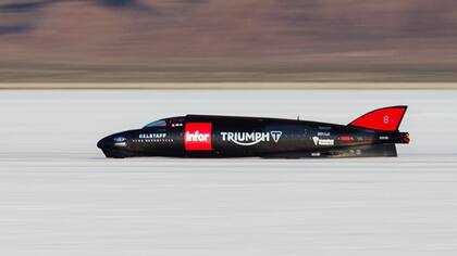 El equipo ya se encuentra en Bonneville (Utah), famoso salar con una superficie de más de 60.000 m2. De hecho, en una prueba el martes último, este cohete se transformó en la moto Triumph más rápída de todos los tiempos al marcar un registro de 274,2 mph (441,28 km/h).