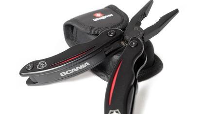 Las pinzas multifunción son un aliado que siempre conviene tener en la guantera del camión o pickup. Útil, práctica y necesaria, la pinza Scania Power es fabricada por la firma suiza Wagner en acero inoxidable y con cobertura de plástico en las zonas de manipulación. Plegada tiene una medida de 10,5 cm, mientas que abierta llega a los 21,5 cm. Precio: $ 515.