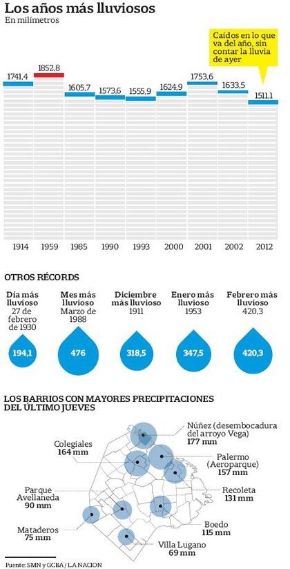 Según estadísticas del Servicio Meteorológico Nacional (SMN), sin contabilizar la lluvia caída ayer, 2012 ya alcanzó el número 11 entre los años más lluviosos de la historia en la Capital, ranking que lidera 1959, con un registro de 1852,8 milímetros.