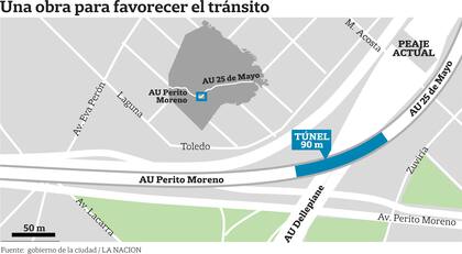 La obra, que tiene un costo total de casi 260 millones de pesos, avanza en dos frentes de trabajo: la unión de las calzadas de las dos manos de la vía rápida -que siempre estuvieron separadas por un espacio hueco-, para luego delimitar allí el carril exclusivo, y la construcción de un túnel que conectará las autopistas Perito Moreno y 25 de Mayo.