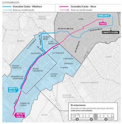 Los carriles exclusivos se iniciarán en el kilómetro 32 de la ruta N° 3, pero entre los kilómetros 28 (Laferrère) y 17 (San Justo) estará el corazón de la obra. En ese tramo, se construirán 16 estaciones cerradas, a las que los pasajeros deberán acceder por medio de molinetes, como en las estaciones de tren o subte, es decir que no pagarán el boleto a bordo. A partir de allí, los servicios se dividirán en dos ramales: el que continuará hacia Ramos Mejía, pasará por Constitución y terminará en el Obelisco, y otro que atravesará la General Paz y finalizará en Once.