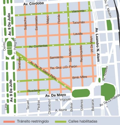 Las restricciones al tránsito alcanzan la zona delimitada por las calles Córdoba al Norte, Avenida de Mayo al Sur, Leandro N. Alem al Este y Carlos Pellegrini al Oeste. Pero este circuito tendrá excepciones que serán las calles Viamonte, San Martín (entre Corrientes y Córdoba), Bartolomé Mitre (entre Carlos Pellegrini y Diagonal Norte) y Piedras (entre Avenida de Mayo y Rivadavia). La medida no rige en las avenidas Corrientes y Diagonal Norte.