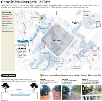 Las obras proyectadas, que surgen del "Estudio de la cuenca del arroyo Del Gato", realizado a partir del trabajo de la Universidad Nacional de La Plata por la Dipsoh, en enero 2010, incluían la realización de derivadores y readecuaciones de las redes de desagües en el casco urbano de La Plata.