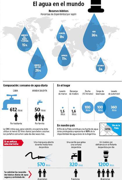 En la ciudad de Buenos Aires se consume 12 veces más agua que lo que recomienda la Organización Mundial de la Salud (OMS): cada habitante de la Capital utiliza, en promedio, 612 litros de agua potable por día. Esto significa 22% de aumento respecto del consumo cuando se privatizó el servicio, en 1990, cuando se usaban 500 litros diarios.