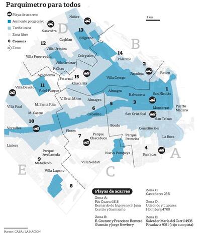 Según el proyecto, la Ciudad estará dividida en cinco zonas. En aquellas calles en las que se busca que haya más rotación vehicular para agilizar el tráfico, la tarifa será progresiva. Esto significa que el costo se incrementará a medida que pasen las horas. Según el mapa preliminar que manejan los legisladores, el 16% de los espacios de tarifa regulada abarcará el microcentro, Av. Rivadavia, parte de Palermo, Belgrano, Villa Urquiza, Floresta y Flores.