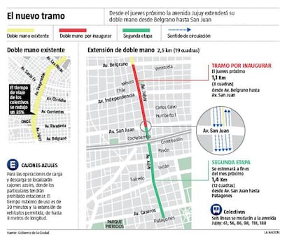 La Ciudad avanza con su estrategia de convertir en doble mano importantes avenidas de gran flujo vehicular: desde el jueves próximo, se extenderá el contracarril de Jujuy, continuación de la avenida Pueyrredón, desde Belgrano hasta San Juan, y que atraviesa los barrios de Balvanera y San Cristóbal, mientras que en una segunda etapa se prolongará la doble mano de la avenida Jujuy, y su continuación Colonia, hasta la calle Patagones, una cuadra después de la intersección con Caseros, en Parque Patricios. Ese cambio se concretaría a fines de marzo. Toda Jujuy tendrá dos carriles de circulación hacia el Norte y tres carriles hacia el Sur, tal como ya tiene hoy de Belgrano a Rivadavia y su continuación Pueyrredón, hasta Figueroa Alcorta.