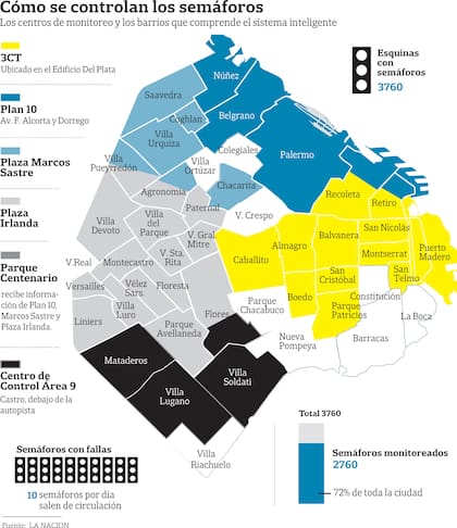 La ciudad hoy tiene seis centros de control de tránsito desde donde se monitorean los semáforos. En cada sala, cerca de 30 operadores monitorean las diferentes variables del sistema de tránsito; sobre la base de esa información toman decisiones en el acto para resolver problemas.