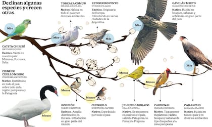 Por la urbanización y los cambios ambientales, las especies rotan; se observan cada vez más gavilanes, caranchos y chimangos; también aumentó la población de loros; adiós a los jilgueros y los chingolos