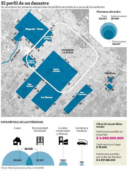 Según datos oficiales preliminares del municipio platense , los 165.037 vecinos afectados en forma directa por la tragedia sufrieron un perjuicio de unos 4000 millones de pesos. El dato surge de un estudio de la Agencia Platense de Recaudación y de la Secretaría de Gestión Pública de la comuna, que delimitó los sectores "críticamente afectados" de la ciudad.
