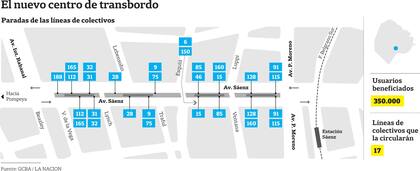 El nuevo ordenamiento de la avenida Sáenz permitirá beneficiar a 17 líneas de colectivos que circularán dentro del corredor. Las que tienen parada son: 46, 9, 15, 28, 31, 32, 75, 85, 91, 112, 115, 128, 160, 165 y 188. Las que no tienen parada son la 6 y la 150. La reestructuración de las paradas también implica que los colectivos sólo paren una vez en los 550 metros en los que se extiende el centro de trasbordo. Antes, algunos colectivos en ese tramo se detenían hasta tres veces. Por lo que los peatones tendrán que caminar más para llegar a sus paradas.