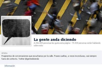 En Buenos Aires, a las palabras no se las lleva el viento. Los diálogos, las frases y los murmullos que se escuchan en los colectivos, en la cola del supermercado o en las esquinas menos pensadas aparecen, como por arte de magia (virtual), en "La gente anda diciendo", la página de Facebook ( http://www.facebook.com/LaGenteAndaDiciendo ), donde más de 250 mil usuarios recuperan diariamente retazos de conversaciones oídas al pasar. Publicadas en el "muro" o en el Twitter del proyecto ( @gentediciendo ), el impacto de esas huellas verbales es tal que entre todas construyen, a la manera de un rompecabezas, un retrato inesperado y clandestino del espíritu porteño.
