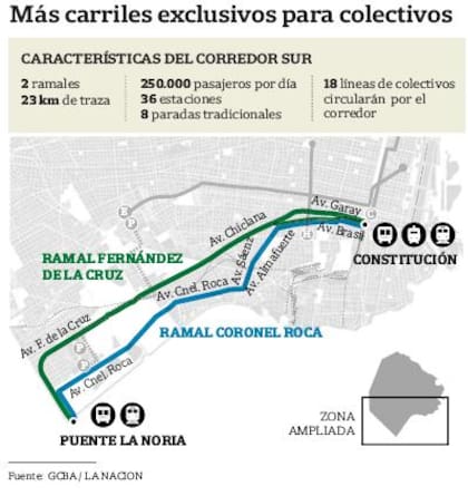 El Metrobus del Sur contempla el tránsito de 18 líneas de colectivos, siete de ellas en toda su extensión. El servicio, que tendrá dos ramales, atravesará los barrios de Villa Riachuelo, Villa Soldati, Villa Lugano, Nueva Pompeya, Boedo, San Cristóbal y Parque Patricios, hasta llegar a la estación Constitución.