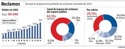 Los temas que preocupan a los porteños son los mismos desde hace años y se refieren al espacio público. De los 68.511 reclamos recibidos en el primer semestre de este año por el gobierno porteño, el 30,81% corresponde a problemas con el alumbrado; el 29,7% se refiere a saneamiento urbano -que incluye todo lo relacionado con la recolección de residuos-; el 16,31% son sobre arbolado; el 10,25% tiene que ver con las aceras, y el 6,76%, con quejas sobre el pavimento de la ciudad.