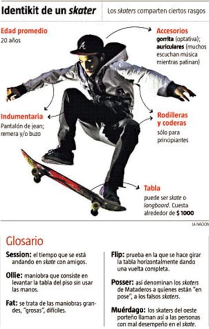 Marcos, que sí trabaja cargando y descargando fletes, es el único de todos los skaters presentes que lleva rodilleras y coderas. Consultados sobre si esos accesorios forman parte de la indumentaria típica de un skater , la respuesta fue a coro y al unísono: "Nooooo, no hay una vestimenta determinada". Según David, "esos que usan gorrita y ropita de marca son todos «possers»", un vocablo acuñado por el grupo que imita una supuesta palabra en inglés para señalar a alguien que posa. Agrega Lucas: "Se producen, pero no saben andar en skate ".