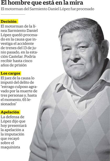 Daniel López, el maquinista del tren de la línea Sarmiento que provocó la tragedia de Castelar el 13 de junio pasado, fue procesado por el juez de Morón, Jorge Rodríguez, que lo acusa del delito de estrago culposo agravado por la muerte de tres personas. López, que seguirá en libertad, además, resultó embargado por la suma de 10.000.000 de pesos.