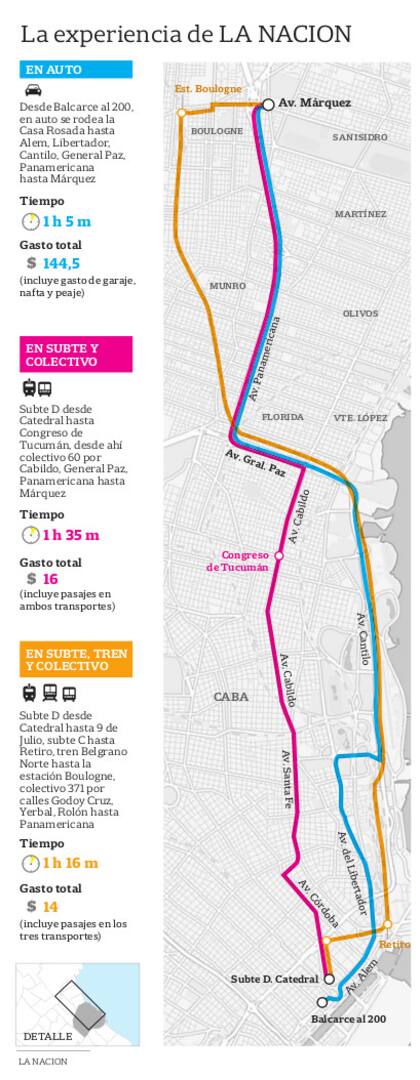 Los nuevos trenes, las avenidas con carriles exclusivos o el Metrobus contribuyeron a mejorar el tránsito. Pero en una experiencia que hizo LA NACION desde el centro porteño hasta Márquez y Panamericana en San Isidro en distintos medios, tardó en todos los casos más de una hora en llegar a destino, a pesar de que son apenas unos 24 kilómetros de distancia. Testimonios de ciudadanos que emprenden similar trayecto también dan cuenta de los trastornos existentes.