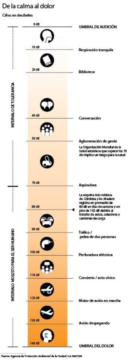 El límite impuesto por ese organismo supranacional es 70 dB: en ese nivel, el ruido es "molesto", y superarlo durante un tiempo prolongado implica riesgo para la salud.