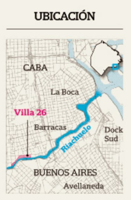 La 26 tiene una estructura diferente de la de otras villas porteñas. Tiene un sólo pasillo con casas a ambos lados; algunas, sobre la margen del Riachuelo. Hay una que llama la atención porque cuelga sobre el agua, apoyada en columnas de hormigón que se hunden entre el fango y la basura. “Las hizo un tío nuestro porque cada vez que el río subía se llevaba una parte de la casa. Así ganamos un espacio más, que usamos para dormir o cocinar”, cuenta Ángeles Parindari, que desde que nació vive allí junto a sus cinco hermanos, sus padres y su abuela.