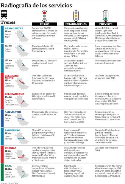 LA NACION recorrió los seis ramales; dialogó con los usuarios y constató los puntos a favor y en contra que tiene cada línea. Tanto en el Sarmiento, donde el boleto subió hasta $ 3 con la SUBE, como en el San Martín, los pasajeros se mostraron muy conformes con el servicio y advirtieron cambios positivos. En tanto, en las otras líneas donde aún no se sumaron nuevas formaciones algunos ramales mejoraron la higiene y la información, pero sigue habiendo cancelaciones (ver aparte).
