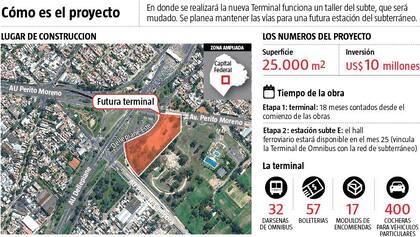 Donde se proyecta la construcción de la terminal de ómnibus funciona un taller para subtes de la empresa Metrovías, que será mudado. Se planea mantener las vías existentes para extender una estación la línea E, que llega hasta Plaza de los Virreyes.