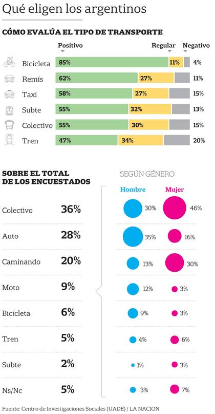 Los hombres prefieren el auto y las mujeres el transporte público. Colectivo, auto, subte; en ese orden eligen trasladarse los porteños para ir a trabajar. El tren es el medio peor percibido en la Capital, en el Gran Buenos Aires y en el interior del país, según un estudio realizado por el Centro de Investigaciones Sociales de la Universidad Argentina de la Empresa (UADE) y la consultora Voices! Según los especialistas, tiene que ver con las relaciones que cada género establece con estos medios.