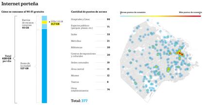 Mientras en la villa 1-11-14 se utilizan 21 GB por día, en el polideportivo Parque Patricios la demanda alcanza a 11,3 GB (1,8% del total); en la Facultad de Derecho, 7,9 GB (1,3%), y en la plaza Lavalle, 6,4 GB (1%).