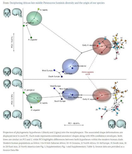Mounier y Mirazón constataron fuertes similitudes entre las formas craneales de los 263 cráneos estudiados -fósiles y modernos de los 29 grupos de población hallados en África, Europa, China, Australia y Canadá- y la posición de éstos en un árbol de parentesco basado en datos genéticos.