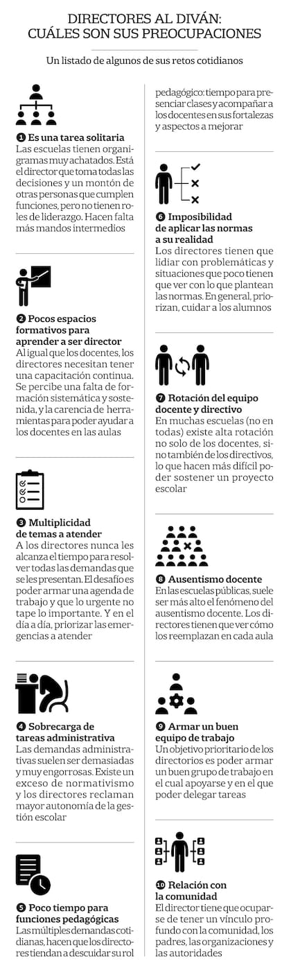 Su realidad es la misma que viven los directores secundarios de todo el país, independientemente de la geografía o el contexto en el que estén insertos. Porque el cargo, en sí mismo, trae aparejados varios desafíos que les son comunes: la soledad de su tarea; la sobrecarga de temas administrativos; el no poder priorizar sus tareas pedagógicas por tener que atender lo urgente, y lidiar con la rotación y el ausentismo de los docentes, entre otras cosas.