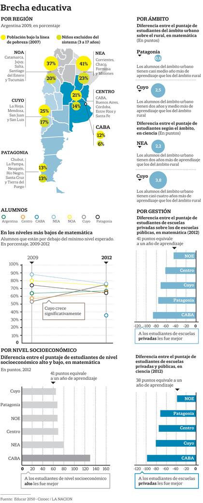 Dados los cortes que utilizaron, los resultados no deberían sorprender: las escuelas de ciudad de Buenos Aires, privadas y urbanas y a las que van los chicos de mejores niveles socio-económicos son las que tienen los mejores rendimientos académicos. "La primer conclusión a la que llegamos es cuan diferente es el aprendizaje de un alumno promedio en Ciudad de Buenos Aires del de sus pares en Cuyo, Noroeste o Noreste. Es como si estuvieran viviendo en dos países diferentes. En estas tres últimas regiones, más de la mitad de los alumnos de 15 años están por debajo del nivel mínimo de aprendizaje en matemática, ciencia y lectura. Si te fijás como mejoraron México, Chile, Brasil o Perú en PISA desde el 2000, fue reduciendo el porcentaje de alumnos que están por debajo de los niveles mínimos. Si queremos reducir la desigualdad de aprendizaje en nuestro país, nosotros necesitamos hacer lo mismo en las regiones más rezagadas", explica Alejandro Ganimian, miembro del Consejo Asesor de Proyecto Educar 2050. A la vez que agrega, que "si te ponés a comparar todos los factores que inciden en la brecha, el que más subsiste es el de nivel socio-económico".