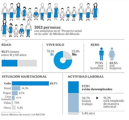 Através de su Programa Salud en Calle, MDM brinda atención primaria de salud y acompañamiento social a personas que sobreviven en estas condiciones. Carolina Karagueuzian, su responsable, asegura: "Prevalecen hombres mayores de 50 años, muchos con vínculos familiares rotos, sin trabajo, algunos con problemas psiquiátricos y otros que padecen ciertas adicciones. Son personas que sufren una gran falta de contención frente a una crisis y no tienen dónde apoyarse".