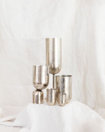 En tanto, las copas Cactus simbolizan la expansión de nuestras vasijas internas. Por eso hay una pequeña e invertida y otra más grande, lista para llenarse de vino. Son de alpaca martillada con soldaduras de plata. También las copas Cascabel, simples y lúdicas, que evocan la alegría de convocar a todos a la mesa. Al moverlas se escucha el sonido de una campana: “Un llamado delicado a reunirse, reconectar y celebrar lo que nos une”, dice.