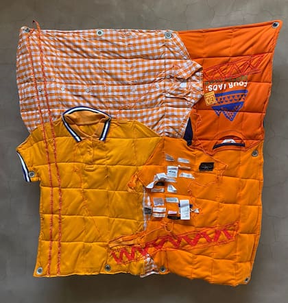 La incursión en el mundo de la costura viene de su infancia, en el garage donde su abuela Hilda, la costurera de Etruria, al sudeste de Córdoba, cosía la ropa de todo el pueblo. “Allí confeccioné mis primeros disfraces”, repasa. El collage textil destaca las costuras, revela el origen y pone en valor la cultura del lugar. Los rótulos –desde Adidas a Nike o Tommy Hilfiger – funcionan como marcas. No solo de firmas globales, sino también de modos productivos de consumo global.
