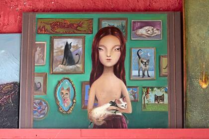 La niña de los gatos debería estar en manos de su comprador, aunque la magia de Marta Vicente hizo que volviera a ella. “Esta pintura la compró un extranjero en una exposición que hice en Buenos Aires, en 2003. El hombre me la pagó, viajó al sur y quedó en buscarla a la vuelta. Nunca más me contactó y a mí me dio pena venderla. A lo mejor el inconsciente me la trajo de vuelta”, dice la artista de los símbolos presentes y los parajes que imagina y sueña, con personajes principales.