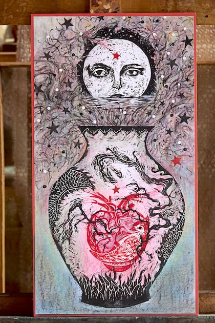 En el atelier de Marta Vicente, acrílicos, óleos, tintas, lápices y pasteles tienen su espacio de guardado. Lo mismo con las tintas, los rodillos y los trapos. En el caso de las obras, las conserva con delicadeza y exhibe según las ganas y la intuición. Están los cuadros pequeños que aborda despacio, las piedras pintadas que encuentran su cara de diosa, estrella o luna, las apariciones zoomórficas, xilografías en distintos formatos y el recuerdo de lo que se fue, porque la obra de esta artista es un tesoro que viaja por las manos.