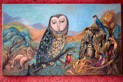 “Me siento influenciada por movimientos medievales primitivos o románticos, aunque hay artistas y autores que me acompañan más allá del estilo y el tiempo: William Kentridge, Anselm Kiefer, Paula Rego, Miqel Barceló, Leonora Carrington o Lewis Carroll. No creo que mi obra sea surrealista, sino que está relacionada con algo de la emoción que no intelectualizo demasiado. La influencia más fuerte es sin dudas la de Luis Scafati, que si bien pareciera que tuviéramos mundos diferentes nosotros sabemos lo que tenemos en común y cuánto nos parecemos. La influencia sobre todo la vida”, resume la creadora de astros, gatos, lechuzas y ojos.