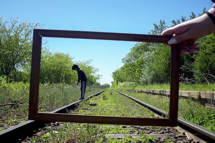 Marco visual. Jennifer (9 años, Franklin), que sigue las clases del taller de fotografía de manera virtual, pone manos a la obra y experimenta otro modo de la composición expresiva con este juego de recuadro dentro del encuadre: así, la vías abandonadas del tren y el verde que lo rodea ganan fuerza y belleza.