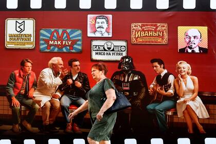 En esta imagen hay tres niveles. En primera línea, la señora que avanza, vestida como podría estarlo cualquier mujer en cualquier rincón del mundo occidental, sin mirar siquiera el estallido pop que asoma en la segunda línea: Marilyn, Darth Vader y Doc Brown en alegre convivencia con Stalin y Lenin. La señora, quizás vecina del lugar, pasa frente al restaurante Mak Fly (¿homenaje a Marty McFly, el protagonista de Volver al futuro?), especializado en hamburguesas y papas fritas, y abierto sobre la Avenida Lenin, en la zona bajo control ruso de Mariúpol, ciudad portuaria que la comunidad internacional sigue reconociendo como ucraniana. Aquí viene entonces el tercer nivel de la foto: la liviandad juguetona del gesto pop (Lenin, psicodelia y el jopo de Presley), incrustada en territorio de tragedia. Mariúpol es escenario de guerra y, a la vez, de contrastes indescifrables.