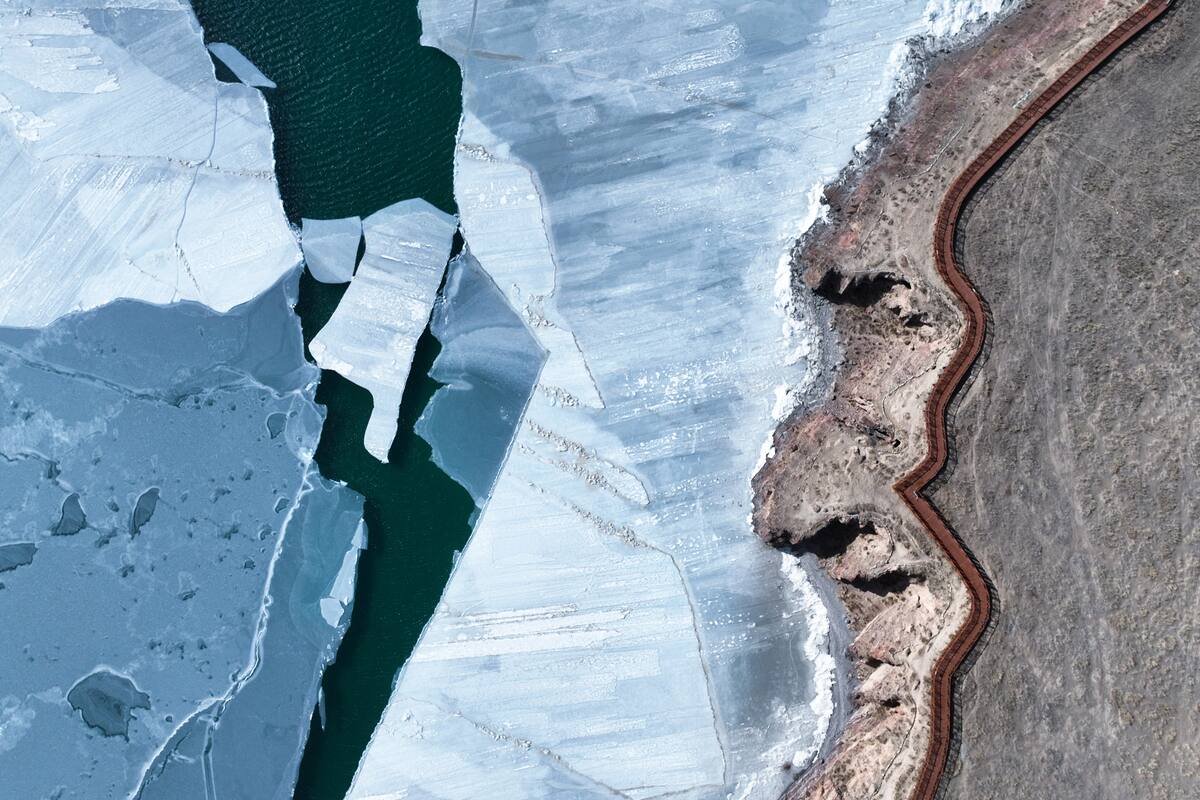 En Errante. La conquista del hogar, película de Adriana Lestido que se sigue proyectando en el Malba, asistimos a bastante más que aquello que la fotógrafa vio durante una prolongada y solitaria incursión en el Círculo Polar Ártico. Hay algo de meditación en ese film, de invitación a suspender lo frenético de la vida cotidiana y confrontar con eso que está más allá y más acá de cada subjetividad: la belleza pavorosa, callada, sublime y distante de un mundo del que apenas somos efímeros visitantes. Un eco de aquello que Lestido registró en las superficies del Ártico resuena en esta imagen aérea. Lo que aquí vemos es el lago Qinghai, el lago interior de agua salada más grande de China, convertido –por el frío y por la distancia a la que fue tomada la foto– en algo así como un cristal escarchado. Una extensión desmedida y extrañamente frágil, radicalmente ajena a la mirada humana.