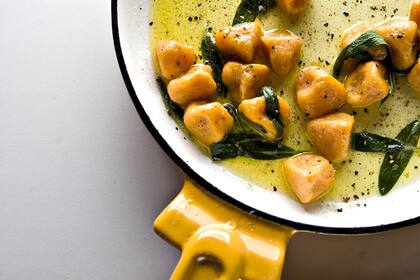 En abundante agua hirviendo con sal, cocinar los ñoquis hasta que suban a la superficie. Colocar sobre la sartén con manteca y la salvia. Agregar unas cucharadas del agua de cocción y queso de rallar. Mover la sartén y servir.