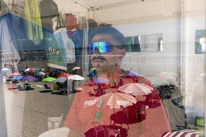 El observador y lo observado. No podemos ver los ojos del guardavidas, pero sí lo que miran. La magia de esta foto: sobre el vidrio de la casilla, destellos de arena, sombrillas, algún bártulo y, allá al fondo –fíjense bien, es sutil, pero está– la línea del mar, el burbujeo de la rompiente, la silueta de los veraneantes que ya se acercaron al agua. La foto es un prodigio de campo, fuera de campo, reflejos y contrarreflejos. A espaldas del guardavidas, un espejo devuelve la imagen de parte de la ropa colgada a su izquierda. Más atrás, a la derecha, se adivina el ramalazo de sol que atravesó alguna ventana, quizás la misma superficie vidriada frente a la cual el guardián de la playa Bristol vigila. Del otro lado, los bañistas van a lo suyo: jugueteos, bronceador, zambullidas, corridas frente a las olas. No lo saben, pero sus gestos descansan en la férrea concentración del hombre de anteojos espejados.
