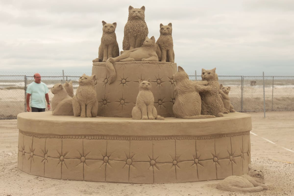 Un festival de arena es existencial aunque no lo quiera: esculturas sostenidas en la porosidad pura; trabajo que se sabe y se disfruta efímero; un canto al difícil arte de apresar el momento. Entre las esculturas que este año se presentaron en el Festival de arena llevado a cabo en Port Aransas, Texas, brilla este conjunto de gatos. Y lo bien que les queda a ellos, reyes de lo escurridizo, esa materia inapresable, sueño del desierto, del mar, de los restos rocosos horadados por infinidad de vientos durante infinidad de siglos en infinidad de lados. El autor de esta escultura supo captar eso que vuelve adorable a tanto felino: su plácida displicencia, su cómoda flexibilidad, la belleza salvaje, delicada, inmanejable que hace pensar que semejante maravilla no puede haber sido fruto del mero azar. Y ese modo distante de observarnos, que en lo real suena a intriga y en esta escultura a discreta burla.