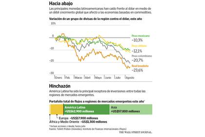 Las monedas de los principales países de América Latina están cayendo, afectadas por el derrumbe de los precios de las materias primas, la perspectiva de un lento crecimiento en China y la inminencia de un aumento de tasas de interés por parte de la Reserva Federal.